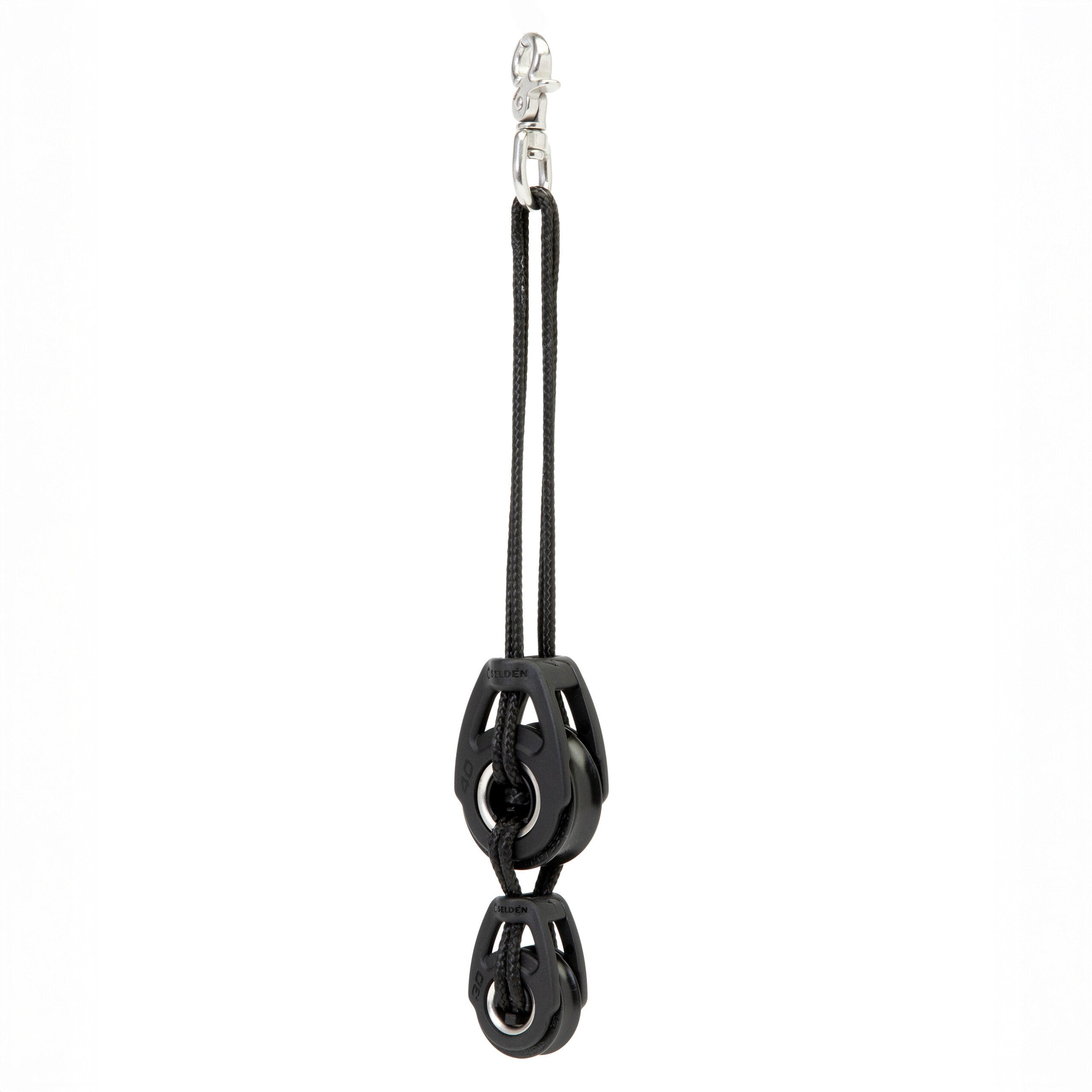 This system features a combination of ø30 mm and ø40 mm Soft-Attachment Blocks, connected using durable ø3 mm Dyneema® loops and a high-quality stainless steel snap shackle. The upper block and snap-shackle are separated 150 mm to reduce the amount of line the sailor needs to manage, making trimming easier and faster.